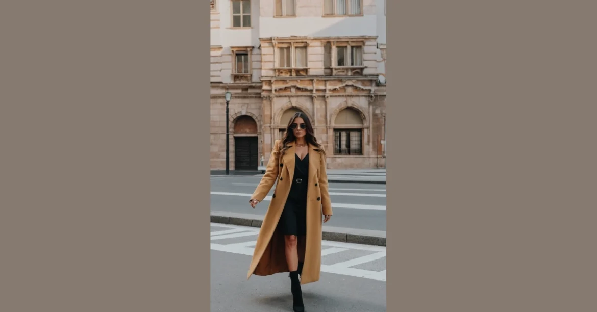This girl is rocking the classy casual look! Her outfit is like a magic trick: it looks super stylish but also comfy enough to wear all day long. It’s like wearing your favorite pajamas, but in public! She’s got a long, flowy coat in a rich mustard color that makes her look like she’s straight out of a fashion magazine. But then she’s got on a simple black dress and boots that say, “I’m also ready to grab a coffee and hang out with my friends.” It’s the perfect balance of looking put together without being too dressed up.