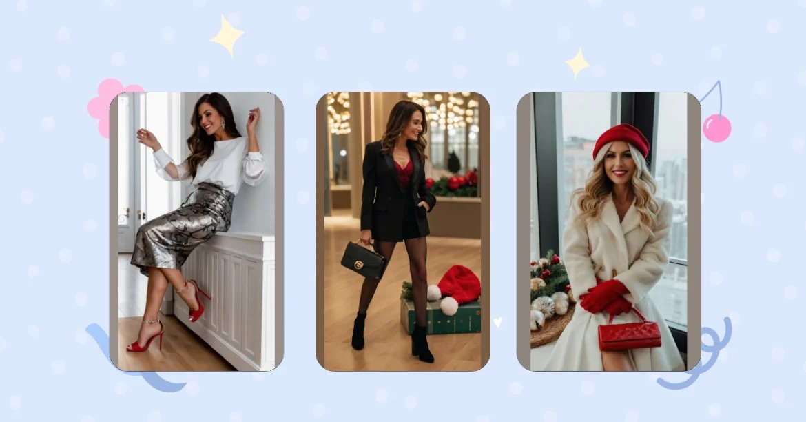Those sleek black ankle boots add a touch of edgy cool to the whole look, while that red handbag is practically screaming, “Merry Christmas!” The darling bow and snowflake accessories are the perfect finishing touches – extra festive flair without being too much. It’s a total Christmas style win!