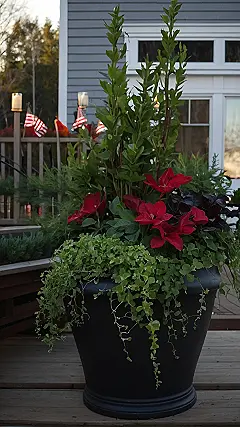This planter is the ultimate winter warrior! Even though it’s chilly outside, this pot is bursting with life. The green leaves, ferns, and that bright red flower are like a little piece of spring hanging out on the front porch. It’s proof that even when it’s freezing, there’s still beauty to be found. It’s like this planter is saying, “Winter? No problem, I’m bringing the sunshine!”