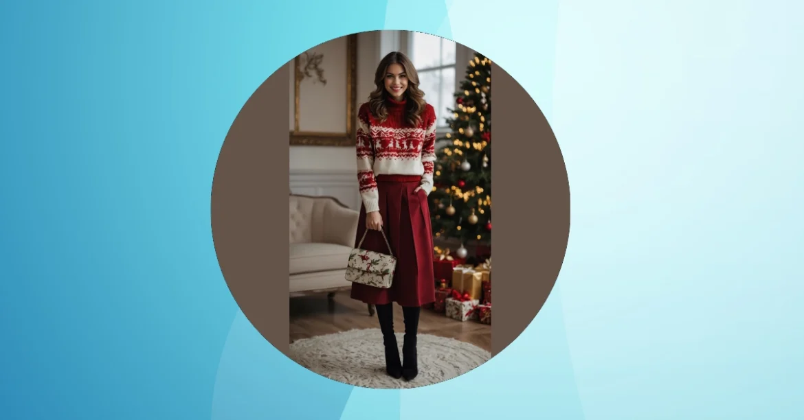 And who knew a Christmas sweater could look this good paired with a sleek red skirt and a handbag that practically has its own tiny holiday party going on? This whole outfit is a masterclass in looking effortlessly put-together for any festive occasion, from a fancy dinner to just chilling by the twinkling Christmas tree. It’s like she’s telling everyone, “Yes, I’m celebrating, and yes, I look fabulous doing it.” So next time you’re planning your holiday look, take a cue from this queen and make your Christmas sweater outfit a total showstopper!