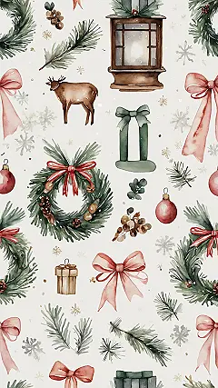This festive wallpaper is basically throwing a massive holiday party, and you’re all invited! Look closely, and you’ll spot a cute little deer who clearly just got lost on his way to the North Pole, probably distracted by all the sparkly red bows. Those wreaths aren’t just for doors anymore; they’re here to make your screen feel extra cozy. It’s like a winter wonderland exploded, but in a totally good, no-mess kind of way, filling your space with a warm, fuzzy feeling.