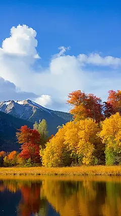 Imagine a peaceful lake reflecting the vibrant colors of autumn. The trees along the shore are like artists, painting the landscape with reds, oranges, and yellows. It’s as if they’re putting on a grand show just for us! The fallen leaves are like a giant, crunchy carpet, perfect for kicking through on a crisp autumn day. And look! There are little bursts of orange flowers peeking out from the ground, adding a pop of color to the scene.