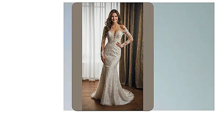 Talk about making an entrance! This amazing “fit and flare” wedding dress totally gets it. See how it hugs everything perfectly on top, like it was custom-made just for her? That’s the “fit” part doing its magic, showing off her awesome silhouette without needing any fancy Instagram filters. Plus, those lacy sleeves and the gorgeous neckline are giving off serious main character vibes, making her look ready to glide down the aisle, probably even before her morning coffee. She looks so confident, you just know she’s thinking, “Yep, I woke up like this, looking this fabulous.”