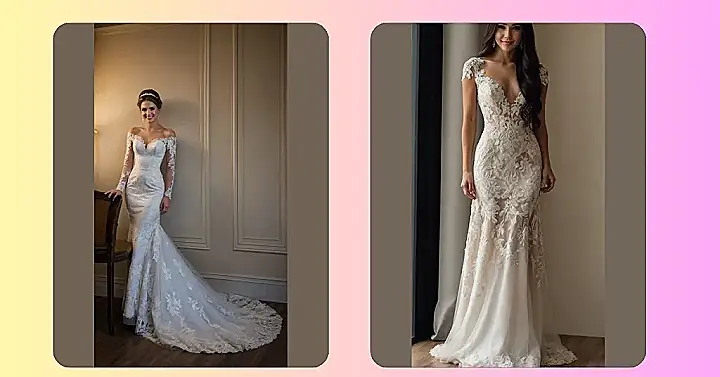 Let’s kick things off with satin, the fabric that feels like a blissful dream. When you slip into a satin fit and flare, it’ll be like wearing a lovely cloud down the aisle! Whether you choose a glammed-up design or a more minimalist look, satin will make sure you shine bright on your special day. On the flip side, lace is here to sprinkle some magic and timeless flair into your look. It’s like a romantic little secret that adds charm and sophistication!
