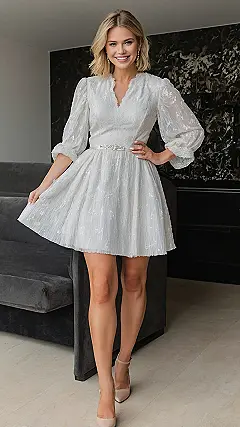 This isn’t just any dress; it’s your new secret weapon for looking cute whether you’re hanging out with friends or just chilling at home. The model looks absolutely radiant, proving this mini can make anyone smile! It’s so versatile, you could totally wear it to a casual meet-up, then easily transition to your next TikTok dance-off. Just remember, with sleeves this voluminous, you might accidentally feel like you could take flight – but don’t worry, you’ll just be floating through your day in fabulous, comfy style!