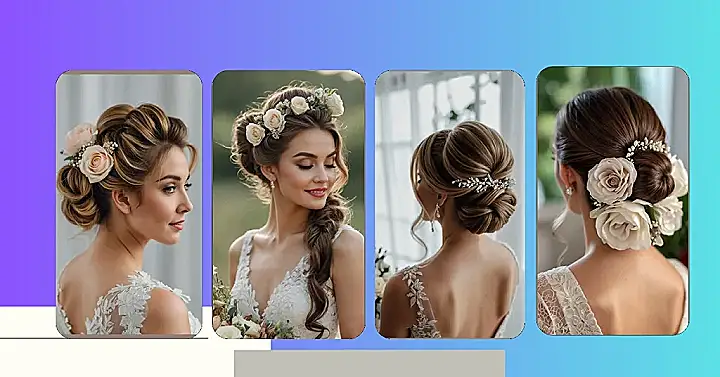 This hairstyle is seriously gorgeous! Imagine walking down the aisle, feeling like a princess with this elegant floral bun. It’s got that perfect mix of fancy and fun – sparkly hair pieces and delicate flowers. It’s like your hair decided to go to a wedding and invited all its best sparkly and flowery friends! This bridal floral bun is not just a hairstyle, it’s a statement!