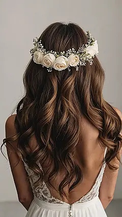 This picture shows a gorgeous hairstyle perfect for a wedding—long, luscious curls topped off with a flower crown! Imagine yourself walking down the aisle, feeling like a total princess with those beautiful creamy white roses and delicate baby’s breath woven into a stunning crown. It’s the kind of look that’s both elegant and fun, so you can dance the night away without worrying about your hair falling out of place. Who needs a tiara when you’ve got this much floral fabulousness?