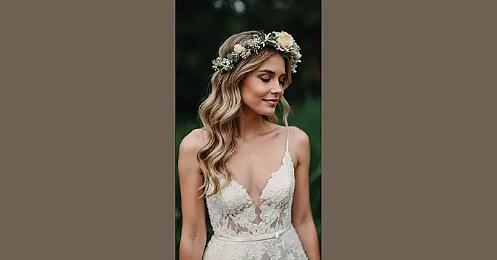 Seriously though, this hairstyle is goals. Imagine how amazing you would feel walking down the aisle with a beautiful flower crown like this, and those romantic waves framing your face. It’s the perfect blend of boho-chic and sophisticated wedding style – definitely something to inspire your own big day!