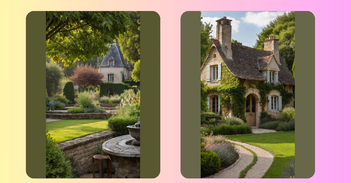 Stepping into this French country garden feels like stumbling upon a secret level in a video game, but way prettier and with actual fresh air. Look at that charming little stone house in the background, with its fancy roof – it probably whispers secrets in French, or maybe just complains about its leaky pipes, who knows! This isn’t your average backyard; it’s got more layers and fancy stonework than a gourmet cake, making you wonder if the garden gnomes here actually do all the heavy lifting to keep everything looking so perfectly imperfect.