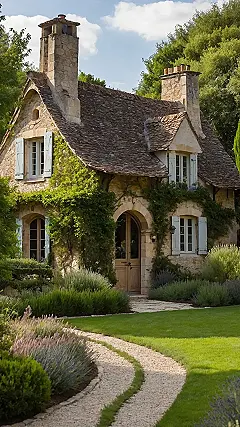 This French country garden looks like it stepped right out of a fairy tale, but way cooler because it’s not animated. That cozy stone house with its perfectly imperfect roof and those cheerful blue shutters? It practically begs you to ditch your phone for a bit and just soak in the ancient, chill vibes. The green vines gracefully climbing the walls make it seem like the house itself is just super relaxed and letting nature do its thing. You can almost imagine a sophisticated French snail slowly making its way across the gravel, probably humming a tiny, elegant tune.