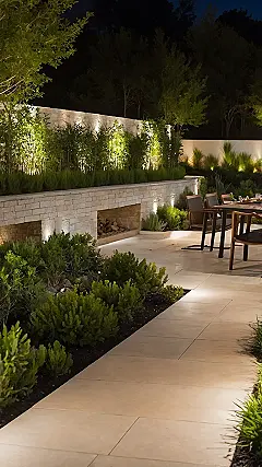 Now, if you’re looking for the ultimate chill spot, this patio has got you covered. Picture this: you’re out here, munching on snacks, maybe even trying to convince your friends that those logs in the wall are actually a portal to a marshmallow dimension. The “flower garden” might be taking a break from its daytime sparkle, letting the green team shine under the spotlights, but it’s still doing its job – providing the best backdrop for epic stories and maybe a little stargazing. Who needs brightly colored petals when you’ve got perfectly pruned bushes and a vibe this cool? Maybe the flowers are just shy after dark!