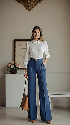 This outfit is proof that you can look totally put-together without feeling like you’re stuffed into a sausage casing! Those epic blue wide-leg trousers are basically saying, “Hello, comfort and style, where have you been all my life?” Paired with that crisp white shirt and a sassy leopard print belt, it’s an outfit that’s ready for anything from acing a school presentation to conquering the mall. She looks so happy and relaxed, probably because these women’s trousers outfits are so flowy, you could probably sneak in a few dance moves without anyone even noticing!