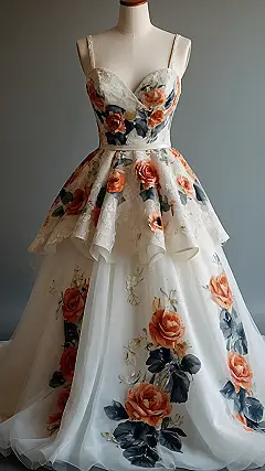 Imagine walking down the aisle in this dress! You’d practically be a walking, talking, totally gorgeous garden. It’s got roses all over it, but not in a grandma’s-wallpaper kind of way. It’s more like a super cool, modern fairytale princess meets flower power. Forget those boring, plain white dresses; this one says, “I’m getting married, and I’m bringing the party…and the petals!”