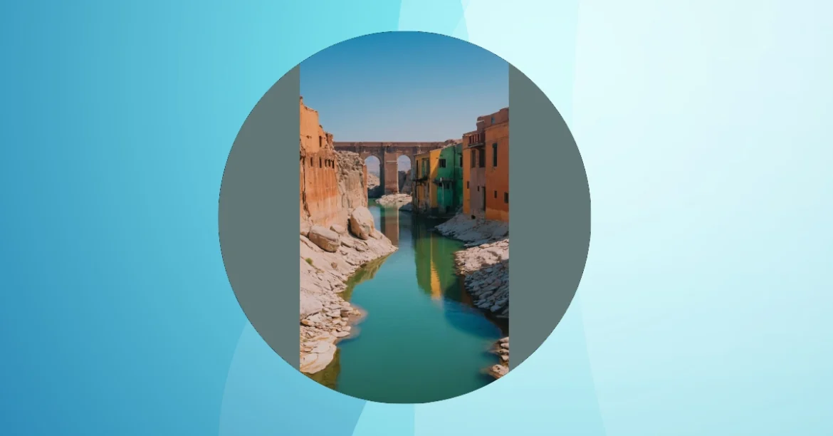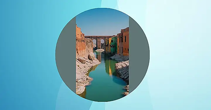 This picture looks like something out of a history book! A stone bridge arches over a bright blue river, which seems to be flowing through a village of colorful, old houses. The buildings look like they’ve been through a lot, with some even having crumbling walls. It’s kind of a cool contrast, seeing the beautiful river right next to these old, worn-out buildings. It’s like the river is reminding everyone that life goes on, even when things are tough.