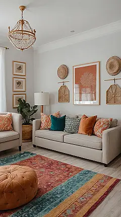 And it doesn’t stop there! That big, squishy orange ottoman is practically begging you to kick up your feet and relax, maybe scroll through TikTok. Even the walls are getting in on the fun with those cool, textured baskets and unique art prints, making the whole space feel like a cool, collected explosion of happiness. Seriously, every little detail, from the leafy green plant to the fancy chandelier, seems designed to make your brain do a little happy dance, proving that your home can totally be your personal mood booster.
