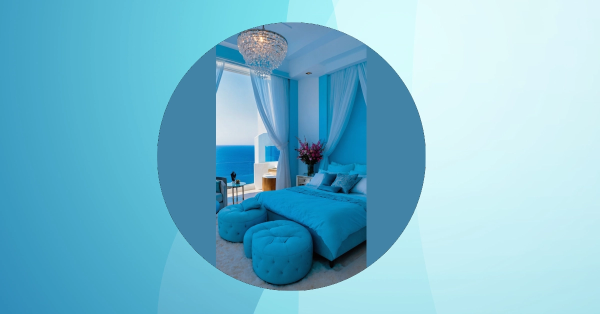 But the blue party doesn’t stop at the walls! Your eyes are then treated to the comfiest-looking bed ever, piled high with fluffy white and various shades of blue pillows, making it an irresistible invitation to flop down. And don’t miss that super cool, sparkly chandelier overhead – it looks like a fancy, glowing planet, adding just the right amount of sparkle to the deep blue backdrop. Even the abstract art piece on the wall joins the fun, swirling with more blues and whites, ensuring you’re truly surrounded. This isn’t just a bedroom; it’s a stylish, serene escape where you can totally embrace your inner calm, making those “moody” moments feel more like a mini-vacation.