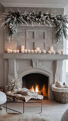Walking into a room with this fireplace would instantly make you want to grab a giant mug of hot cocoa and a fuzzy blanket. It’s like a cozy winter party decided to land right on the mantelpiece! All those candles are basically having a polite ‘who can glow the prettiest’ contest, with their gentle flames dancing away. And check out that frosted garland and wreath – they’re totally bringing the ‘snowy forest’ vibe without you actually having to shovel anything. It’s the perfect mix of frosty cool and toasty warm, making your fireplace the ultimate hangout spot for chilly evenings.