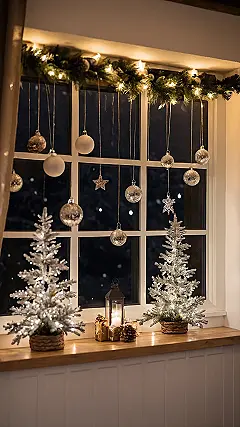 Who needs to brave the blustery cold for a picture-perfect Christmas scene when you can just stage one right in your window? Our little pane of glass has become the star of the show, flexing its festive muscles with twinkling garland and ornaments that look like they’re just floating by on a winter breeze. Those two mini frosted trees on the sill are practically winking, saying, “Yeah, it’s freezing out there, but we’re here, warm and cozy, looking fabulous without all the snow shoveling.” It’s the ultimate ‘Christmas outdoor’ experience, without needing a single extra layer of clothing!