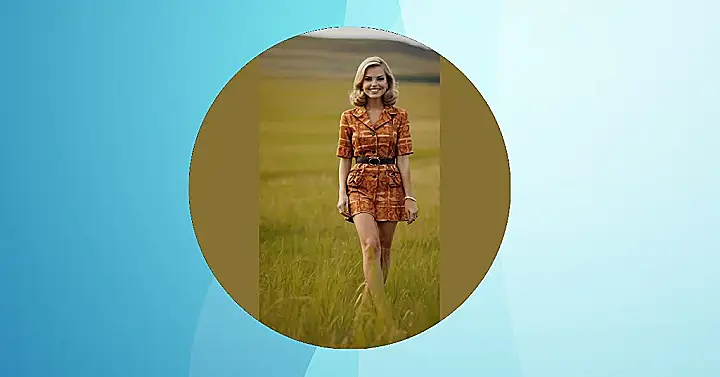 This picture screams “sixties fashion” with its super cute dress and big, bouncy hair. Think of it as a vintage time machine. Can you imagine this girl cruising down the road in a convertible, listening to the Beach Boys, and feeling the wind in her hair? The dress is absolutely wild – a mix of patterns and colors that would make even the coolest cat from the sixties say, “Wowzers!”
