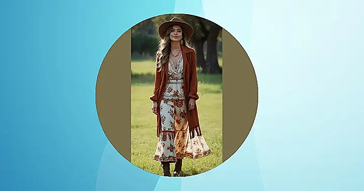 This look isn’t just for strolling through fields; it screams “I’m ready for anything, as long as it involves looking awesome.” Whether she’s about to chase after a runaway goat (with style, of course!) or just enjoying a sun-drenched day, that flowy two-piece and those boots are giving off major confident vibes. It’s like a secret handshake between comfort and killer fashion, making every rancho moment Instagram-worthy. Who knew exploring the great outdoors could be this glamorous?