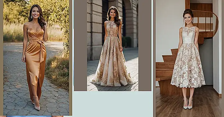 Talk about a showstopper! This latest wedding guest outfit is practically begging for a grand entrance. With its gorgeous champagne color and dazzling gold lace that looks like it’s been painted on, you’ll be the definition of elegant, whether you’re catching the bouquet or just catching a breath after a fierce dance-off. It’s got that fancy vibe that says, “Yes, I dressed up, and yes, I’m absolutely ready for the open bar… of sparkling cider, of course!” Just try not to accidentally get mistaken for a princess who’s wandered off her own royal duties.