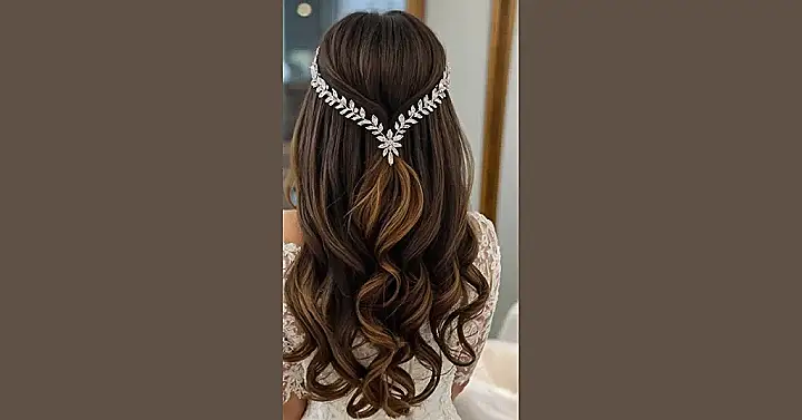 The image shows a gorgeous bride rocking winter-inspired bridal hair. Her flowing, curly locks are adorned with a delicate, dazzling hairpiece. It’s like something out of a fairy tale, right? This hairpiece is a perfect way to add a touch of magic to your winter wedding. Think snowflakes, frosty branches, and the shimmery magic of a winter night.