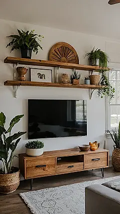 So, you want your place to look like something straight out of a magazine, huh? Well, check this out! This living room is basically a jungle, but in a super organized, Instagram-worthy kind of way. Forget having just a TV stand; we’re talking a whole wooden wonderland with enough plants to make your allergies go wild and shelves styled so perfectly they make you want to start collecting random pottery. This is dream house decor at its finest: comfy, stylish, and probably requires a lot of watering.