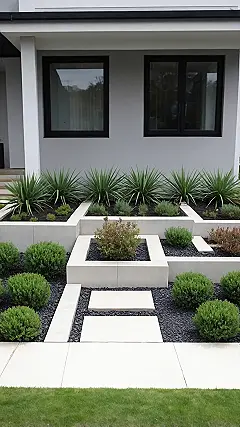 Welcome to the front garden that clearly aced geometry class! This isn’t your grandma’s overflowing flower bed; it’s a meticulously planned landscape that looks like a giant, super chill puzzle. With its crisp, white concrete steps and raised planters, it screams ‘modern art gallery’ more than ‘place where I’ll trip over a hose.’ You can practically hear the plants whispering, “Don’t even *think* about messing up our perfect rows!” It’s a front yard that decided to be effortlessly cool instead of a constant battle with a lawnmower, probably because it knows looking this good takes serious dedication (or a really good landscape designer).