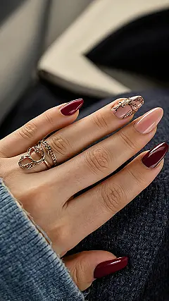 This hand is totally rocking the future of winter nails for 2025, proving that even when it’s freezing outside, your style can be sizzling! Those deep, cozy burgundy nails are like a warm hug for your fingertips, while the soft nude ones keep things super chic. But let’s talk about that one nail – it’s basically a tiny, glittering masterpiece, probably showing off a secret code for how to get out of doing chores or just looking absolutely fabulous at the same time. These aren’t just nails; they’re conversation starters that scream, “Yes, I know it’s cold, but my mani game is still on fire!”