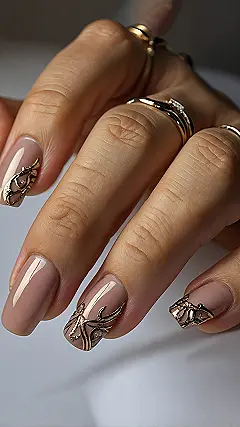Forget pumpkin spice lattes; these nails are the real autumn star! We’re talking about a serious glow-up for your fingertips, rocking a subtle nude base that’s basically the perfect canvas for all your fall fashion dreams. But wait, there’s more! Those intricate golden designs look like they were plucked straight from a treasure chest, giving off major “I’m fancy and I know it” vibes. They’re so shiny, you might need sunglasses to admire them properly, especially when they catch the sunlight reflecting off those beautiful changing leaves!
