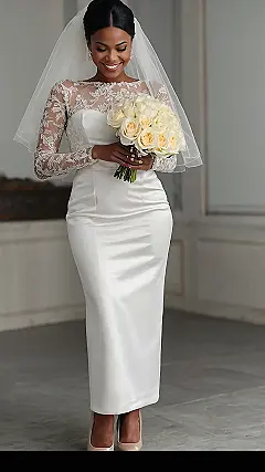 This bridal outfit is seriously stunning! It’s like a super elegant pencil skirt, but make it wedding-appropriate! The long sleeves covered in lace are super fancy, and the whole look is giving off major “I’ve got my life together” vibes. She looks like she could walk down the aisle and then immediately give a TED Talk.