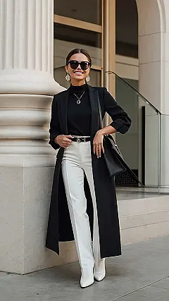 Imagine rocking up to school looking this good! This outfit is like the professional version of black and white cookies, only way more stylish. White pants are daring, but with that long black blazer, you’re totally pulling off the “I’m in charge” vibe. If your job involves important meetings or just wanting to impress people, this could be your go-to look.
