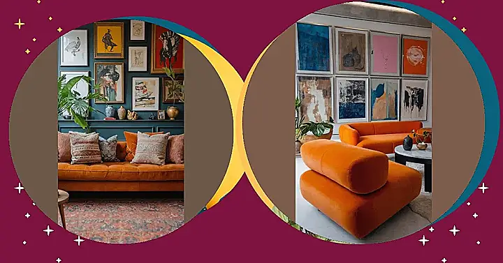 Look up at that wall of pictures – it’s like a cool, abstract party happening right above your head. With all those splashes of colour and wild shapes, it makes the room feel super artistic and definitely not basic. It’s the kind of place where you could totally crash with friends, admire the funky art, and maybe even get inspired to create some messy masterpieces of your own (just maybe not on the orange sofa!). This room screams personality and fun, which is basically the definition of funky.