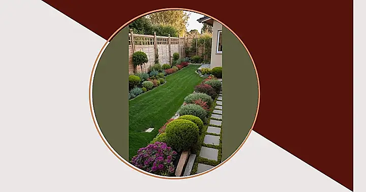 That wavy path made of smooth stones isn’t just for show; it’s like a red carpet for your feet, guiding you through a mini-adventure right in your backyard. And notice the super tidy wooden fence in the background? It’s not just a barrier; it’s practically the garden’s personal bodyguard, standing tall and proud, probably whispering secrets to the leafy shrubs about keeping out pesky squirrels. This isn’t just a random collection of greenery; it’s a masterclass in outdoor gardens design, where every plant, stone, and patch of grass works together to create a spot so cool, you’d actually want to hang out there – maybe even do your homework among the perfectly coiffed bushes!