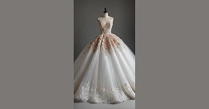 This wedding dress looks like it borrowed an entire flower shop and decided to wear it all at once – in the best way possible! Those incredible 3D flowers aren’t just flat pictures; they actually stand out, making it seem like you’re wrapped in a blooming garden. It’s so detailed, with little sparkly bits everywhere and that perfect, blush-pink rose front and center. You’d probably smell amazing just by wearing it, no perfume needed, and definitely have everyone asking if you brought your own personal florist.