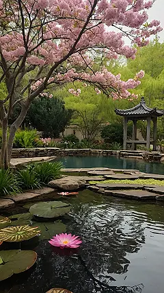 This serene garden is like stepping into a postcard! Imagine yourself chilling by the pond, watching pink water lilies bob gently while beautiful pink cherry blossoms rain down petals like confetti. It’s the perfect place to forget about algebra tests and annoying siblings – just pure zen vibes and gorgeous flowers. That little gazebo even looks like it’s ready for a tea party with fairies!