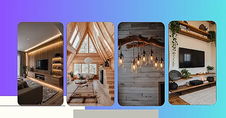 Below the big screen, more of those fantastic wooden planks are doing their job, creating the ultimate hangout zone. Think about it: a perfect spot for your favorite snacks (no crumbs on the fluffy rug, please!), remotes, and maybe even a couple of extra leafy friends just chilling. With those cozy candles giving off a soft glow, this isn’t just a living room; it’s your personal movie theater/relax station, all wrapped up in the natural, earthy coolness of awesome wooden decor. It’s so comfy, you might never leave!