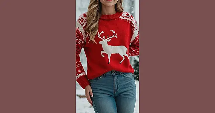 Forget about those “ugly Christmas sweater” parties, because this festive knit is here to prove that holiday fashion can be seriously chic! Our friend in the picture is rocking a cozy red and white sweater, complete with an adorable reindeer parade, that just screams holiday cheer without trying too hard. It’s the kind of top you’d wear to sip hot cocoa by the fireplace or maybe even outsmart Santa’s elves in a friendly snowball fight. She looks perfectly snug and stylish, ready to spread some serious holiday sparkle (and probably win all the family photos).