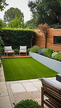 This isn’t your grandma’s garden—it’s got modern vibes with a comfy feel. You’ve got the sleek design of the house, and then bam! This amazing, lush green space pops out, offering a total escape. It’s the perfect mix of relaxed and stylish, showing that even a small garden can pack a huge punch when it comes to making your home feel like a total paradise.
