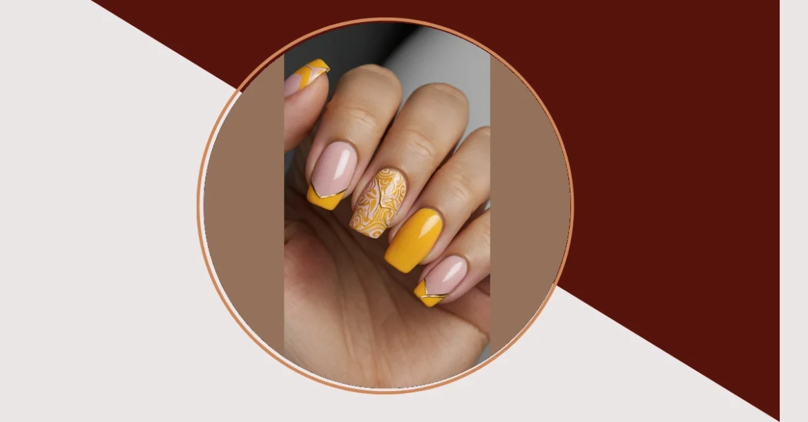 And can we talk about those epic gold details? From the fancy little V-shapes that frame some of the yellow tips to the totally mesmerizing swirl pattern on the accent nail, these nails are basically tiny pieces of art. The soft pink base peeking through the designs keeps it super classy, making sure your hands look effortlessly chic without even trying too hard. These nails are perfect for showing off your fall spirit, whether you’re sipping a warm drink or just scrolling through your phone – they’re basically guaranteed to get a ‘OMG, I love your nails!’ from pretty much everyone.
