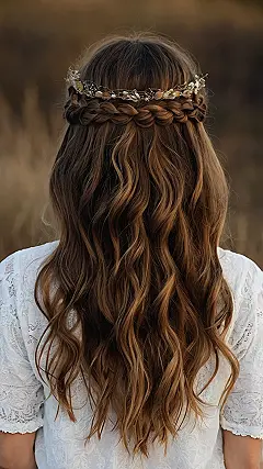 Hey there, future fashionistas! Check out this gorgeous hairstyle – it’s like a total upgrade on classic hippie vibes. Forget the crazy, messy hair of the 60s and 70s (unless that’s your jam!). This look takes the long, wavy hair that was super popular back then and adds a touch of elegance. That braided crown? It’s like a flower crown, but way more sophisticated. Imagine rocking this at a summer festival or even a fancy wedding. It’s a perfect mix of relaxed and refined – kind of like having your cake and eating it too!