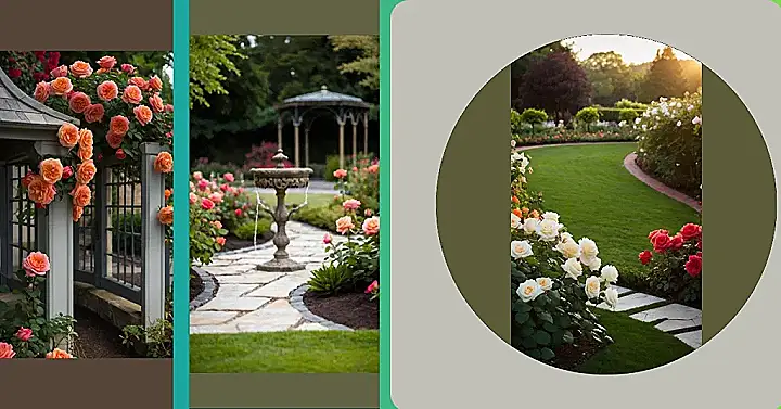 So, you want to design a rose garden that’s not just a bunch of thorny bushes? Well, get ready to ditch the weeds and embrace your inner garden guru! This pic is like a sneak peek into a garden party thrown by flowers, complete with a fancy fountain to gossip around and a gazebo for the head rose in charge. Just picture yourself strolling down that stone path, feeling like royalty, without having to dodge grandma’s prize-winning but totally prickly roses.