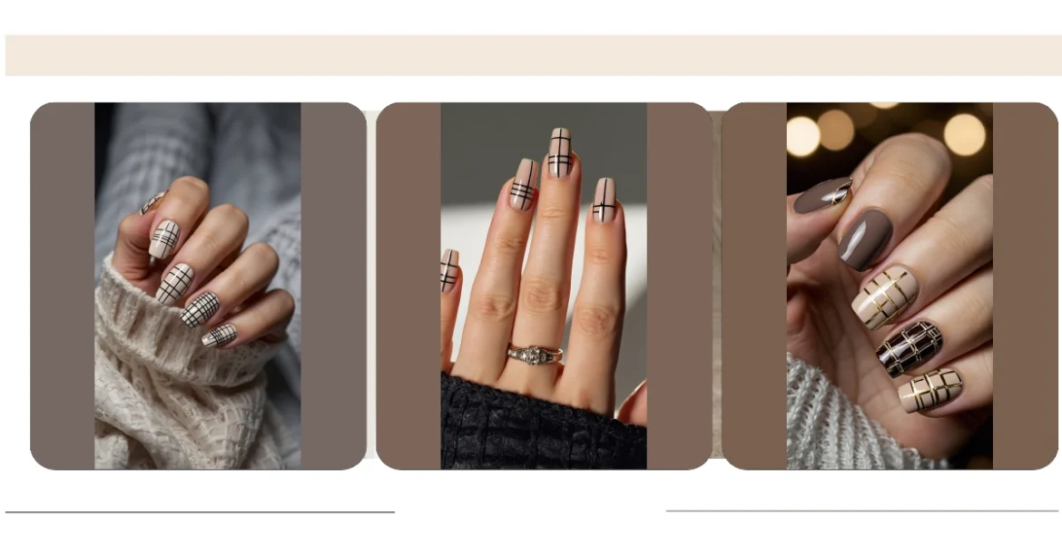 Did your favorite flannel shirt just shrink and magically turn into these super cool plaid nails? Because that’s totally the vibe these gorgeous designs are giving off! With those warm browns, creamy beiges, and sleek black lines (plus a touch of gold that screams ‘I’m fancy but still want to binge-watch Netflix’), these aren’t just nails; they’re a miniature fashion statement for your fingertips. It’s like wrapping your hands in the coziest, most stylish blanket you own, but, you know, without the hassle of actually carrying a blanket everywhere.