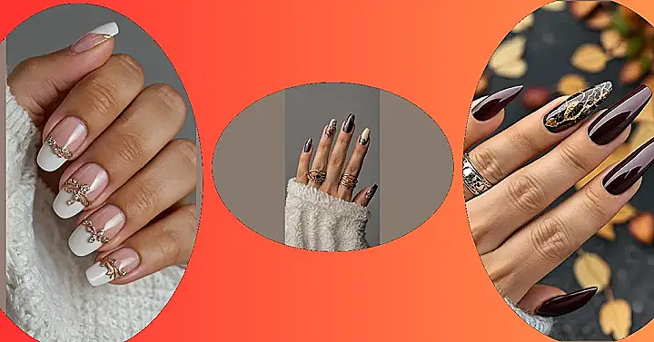 And let’s not forget those stunning rings, adding just the right amount of sparkle and warmth, making your hands look like they’re ready for their own fancy photoshoot. This whole look is basically telling the world, “Yes, I’m here for the turkey, the gravy, and all the compliments on my super stylish nails!” So get ready to show off your perfectly polished pointers – they’re sure to be a conversation starter long before the mashed potatoes run out.