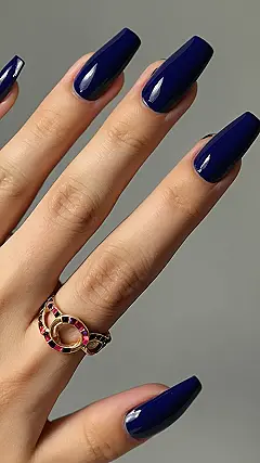 Seriously though, that blue is the best! It’s so rich and dark, like a midnight sky full of sparkly stars. These nails are way more exciting than just wearing mittens all day (although mittens are comfy too!). And that ring? It’s like a little burst of colorful confetti, adding a fun pop to the sophisticated navy. These nails are the ultimate winter accessory— way better than another chunky knit sweater.