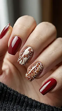 Get ready to carve that turkey and maybe even sneak a second slice of pie without anyone noticing – because your nails will be the main event! These gorgeous deep red and fancy patterned designs are so perfectly Thanksgiving, they might just distract Grandma from asking about your grades. Planning your look for Thanksgiving 2025 might seem a bit early, but hey, a masterpiece takes time, and these nails are definitely ready for their close-up, even if your aunt’s casserole isn’t.