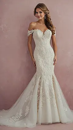 This gorgeous dress is definitely channeling all the best mermaid vibes, making you wonder if the bride might just sprout a tail and dive into the nearest pool instead of walking down the aisle! With its sleek, fitted top and then that dramatic, flowy skirt that flares out, it’s basically the red carpet version of a mythical creature’s tail. Just imagine trying to sneak extra cake in this – good luck hiding anything with a silhouette this fabulous. Plus, that off-the-shoulder lace and the model’s bright smile give off total ‘I woke up like this, but make it wedding day’ energy.