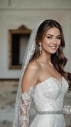 And can we talk about how everything just *works* together? From those dazzling earrings that are probably brighter than your future (just kidding!) to the intricate lace on her dress, every detail is screaming ‘bridal chic.’ But let’s be real, the true MVP is how her glam hair effortlessly drapes, making her look both fancy and ready to bust a move on the dance floor. She’s probably thinking, ‘My hair looks so good, I might just forget to say ‘I do’ because I’m too busy admiring myself!’