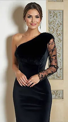 Wow, check out this seriously cool black dress! It’s like it was designed specifically for feeling totally fancy and ready to hit an evening party where you want to look extra classy. The way one shoulder has that sheer lace sleeve with all those patterns, and the other is bare with a fluffy trim? It’s got that ‘wow’ factor without trying too hard. Wearing something like this would make you feel like you just stepped out of a fashion magazine, ready to own the room!