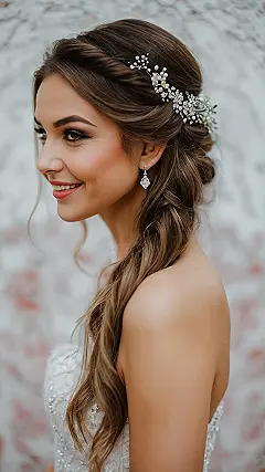 Take a peek at this hairstyle – it’s basically a masterclass in cute bridesmaid hair goals. It’s got that cool, relaxed vibe with the braid and soft waves, but then BAM, you add a little sparkle like that hairpiece, and suddenly you look effortlessly glamorous. It’s the perfect balance – not too fussy that it’ll fall apart after five minutes, but fancy enough that you’ll feel like a total star (after the bride, of course!). This kind of style makes sure your hair looks awesome whether you’re walking down the aisle or tearing up the dance floor.